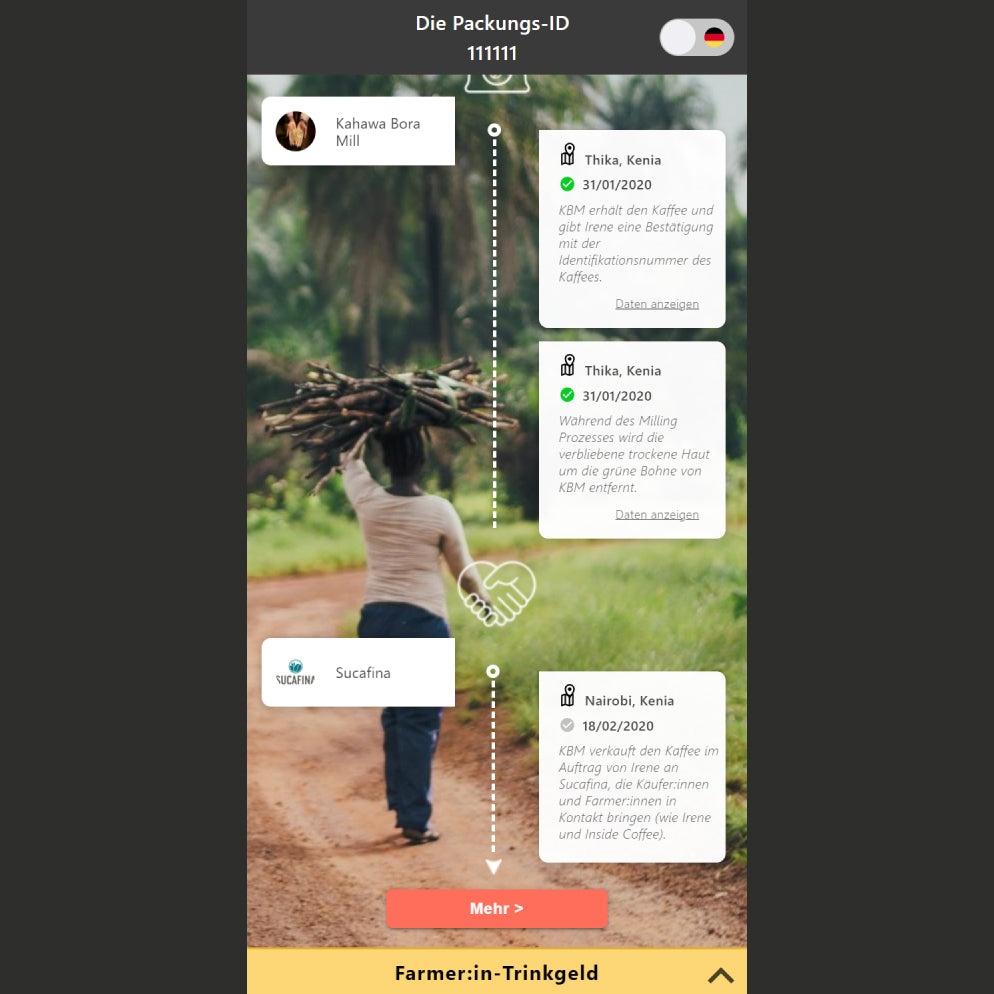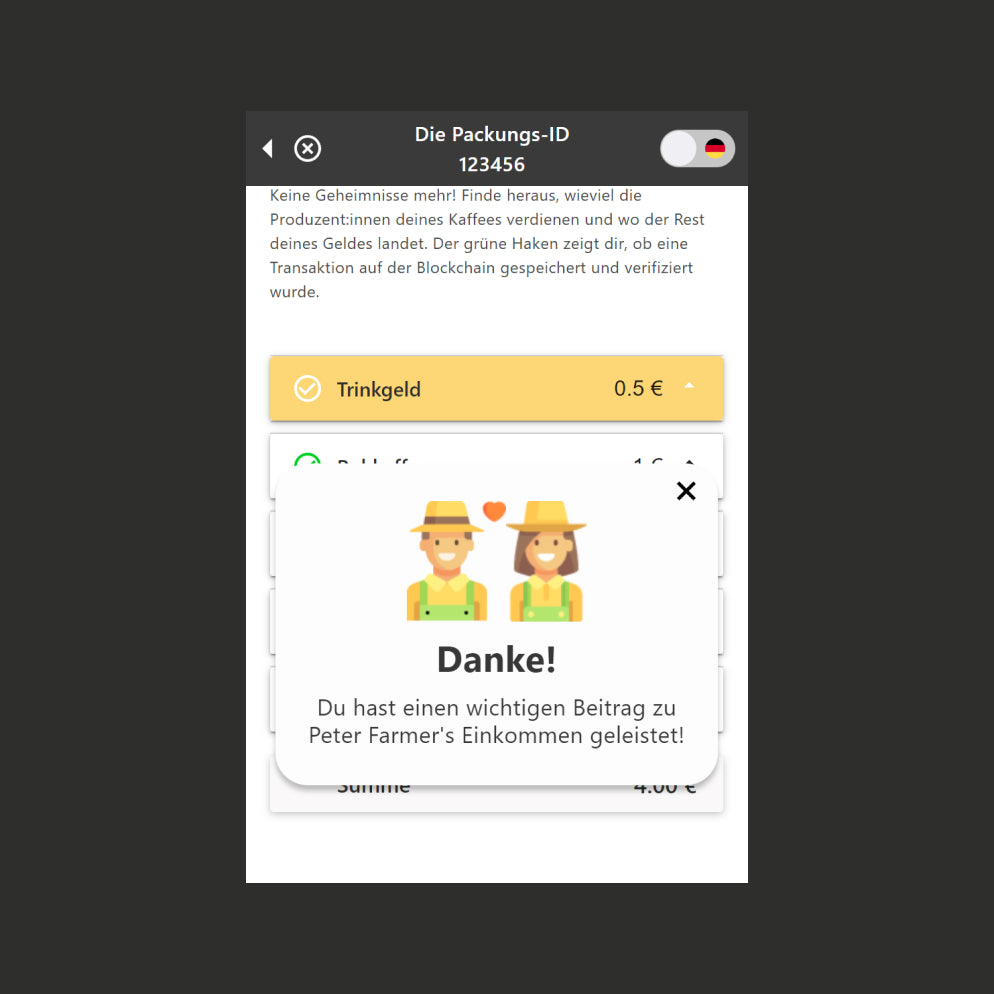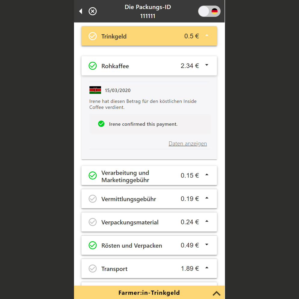 Und das Beste: Dank unserer Transparenz-Technologie können Produzent:innen das alles selbst bestätigen. Und Du kannst es ganz leicht nachvollziehen. Für jede einzelne Packung.